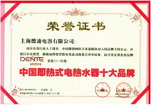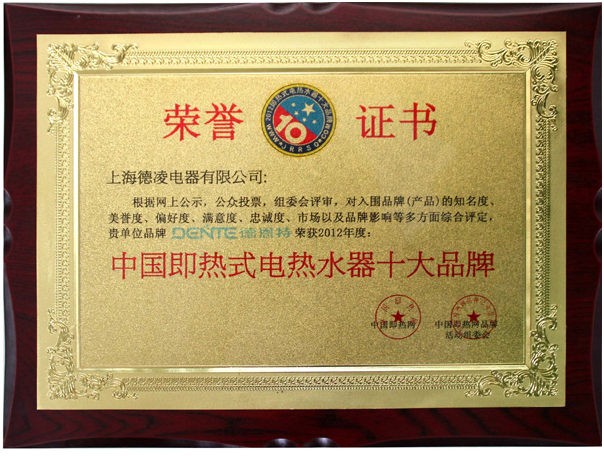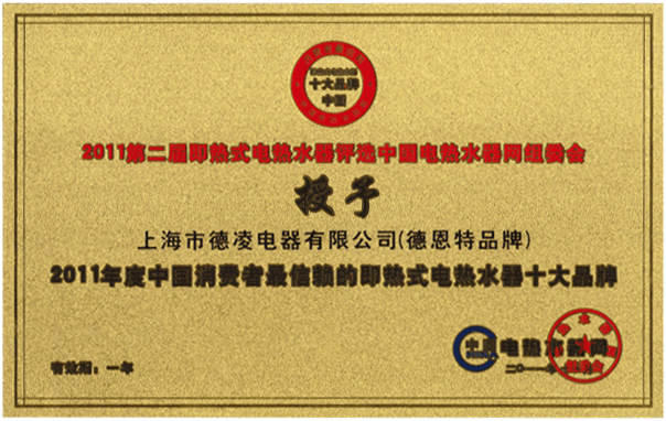 根據(jù)網(wǎng)上公示、公眾投票,組委會(huì)評(píng)審,為入圍品牌(產(chǎn)品)的知名度、美譽(yù)度、偏好度、滿意度、忠誠度、市場以及品牌影響等多方面綜合評(píng)定,上海德凌電器有限公司品牌德恩特榮獲2012年度中國即熱式電熱水器十大品牌。 【中國即熱網(wǎng)www.jrrsq.com】